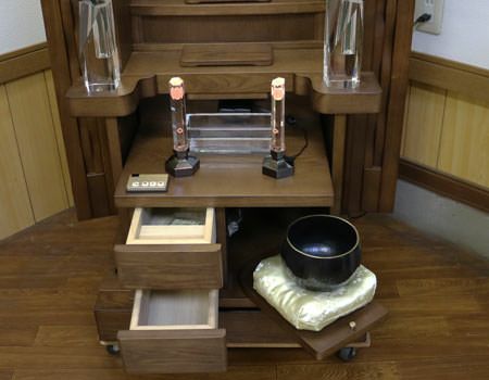 収納は引き出し2箇所。収納経机に、収納リン台がついています。