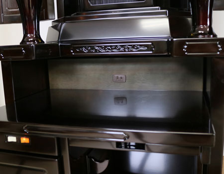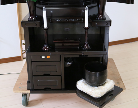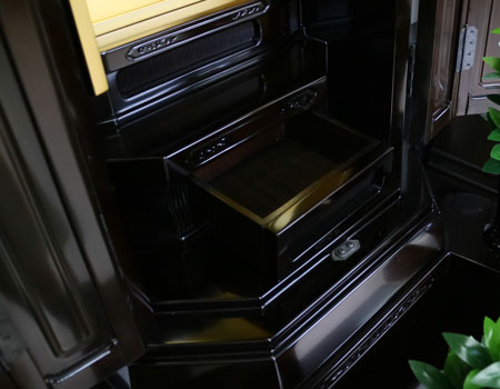 黒檀厨子型収納仏壇、拠点・会場用に最適、椅子仕様でもご本尊様の位置もちょうど良い高さをご提供します。