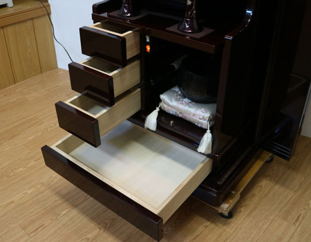 こちらのお仏壇には、収納経机・収納リン台となっております。