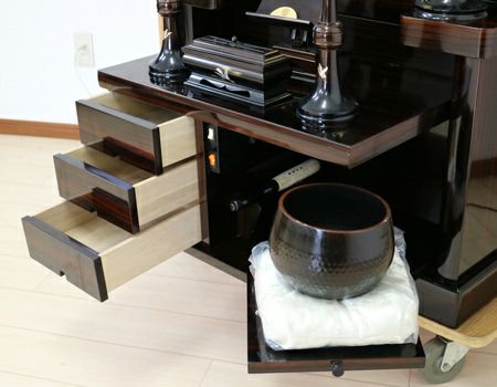 経机の引き出しは1か所・線香箱に引き出しが3か所ございます。