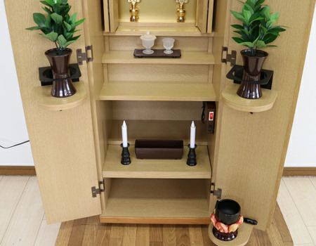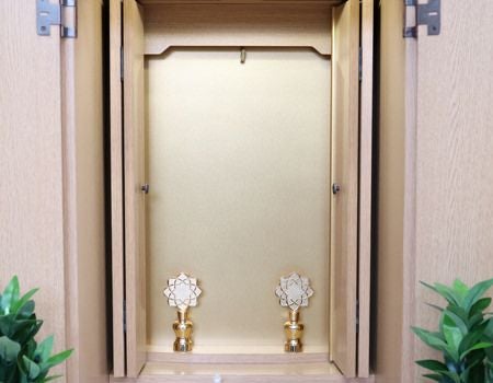 こちらのお仏壇は、花立×2、造花しきみ×2、仏器茶器、角香炉は