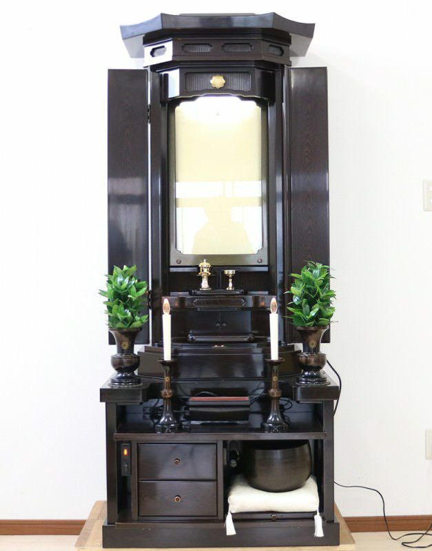 手動扉、厨子内ガラスカバー、引き出し2箇所、厨子下収納1箇所、収納経机、収納リン台