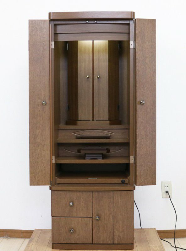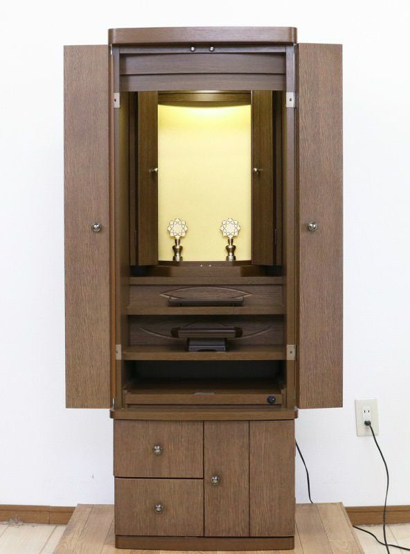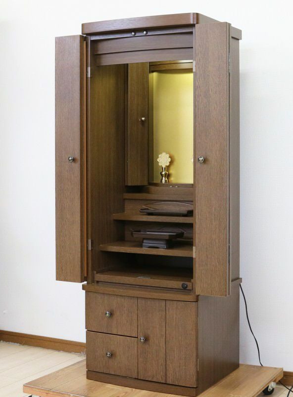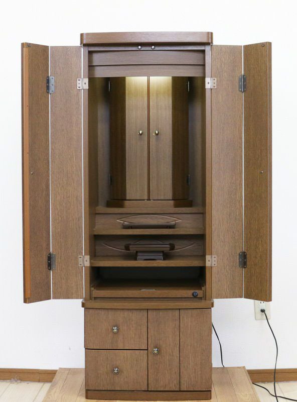 ダーク色の収納充実したシンプルな家具調手動仏壇です。