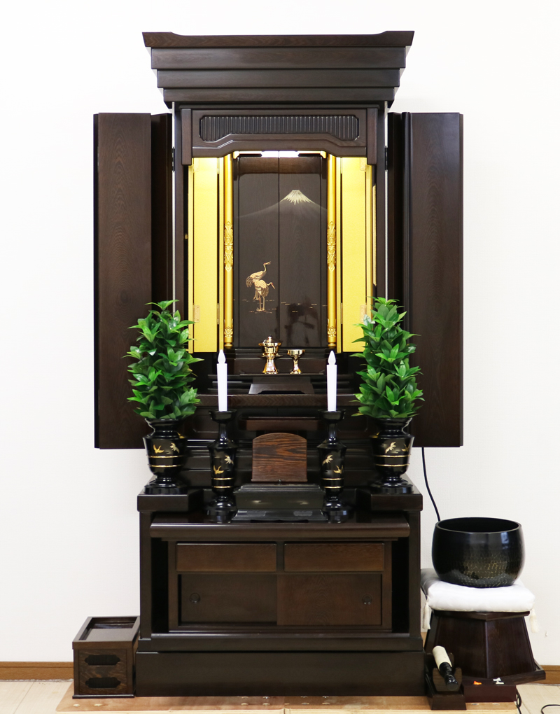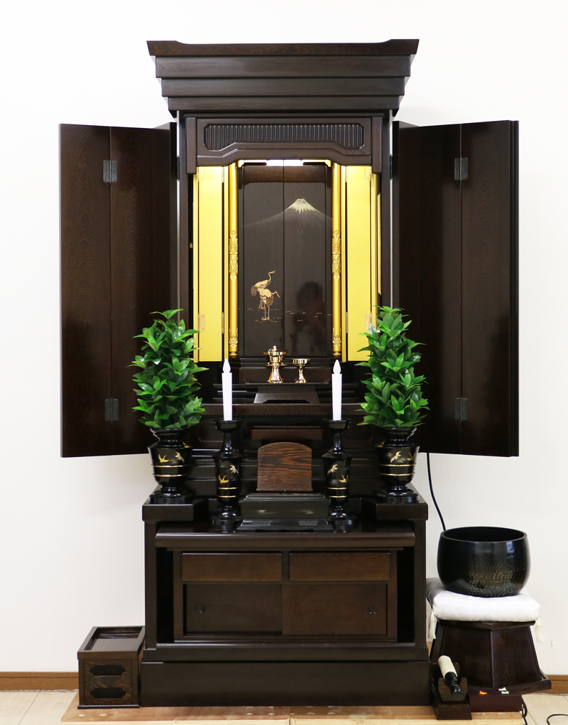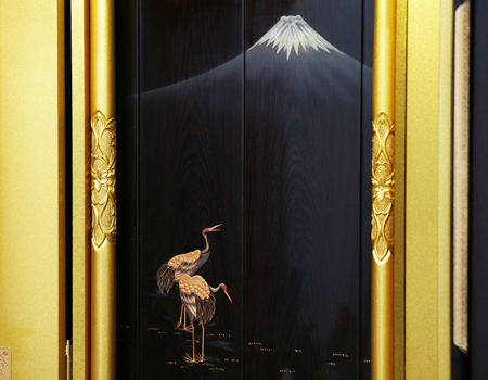 一枚目の鶴と富士山の蒔絵が施されている厨子扉は電動スライド扉です。