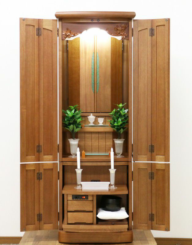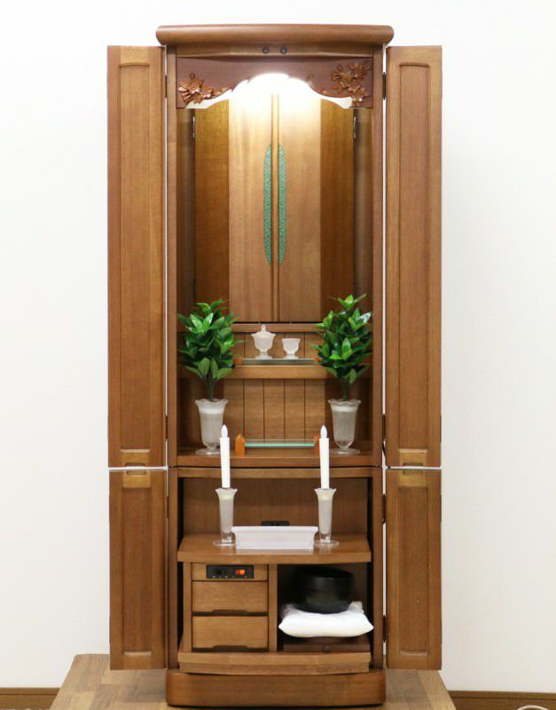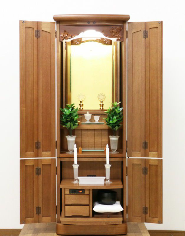 落ち着いた木のやさしさを感じるお仏壇です。婦人部女子部に大人気の商品です。扉が2箇所に分けられていますので、厨子だけ開閉ができスマートにご安置できます。洋室・一人暮らしにも最適です。