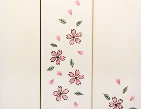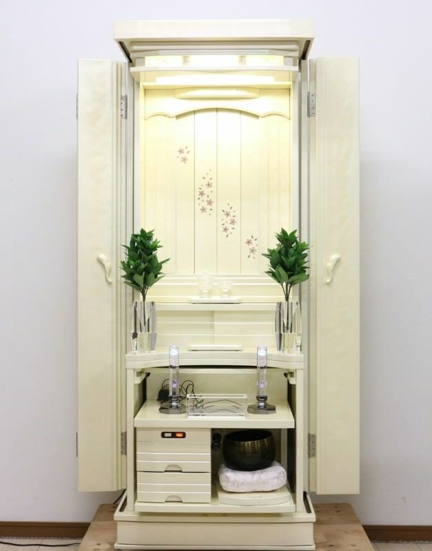 家具調仏壇永遠パールホワイト塗装のお仏壇です。厨子扉の桜蒔絵がとても高級感があります。