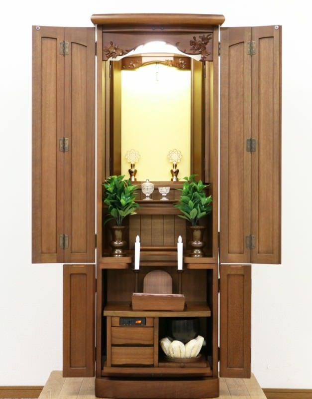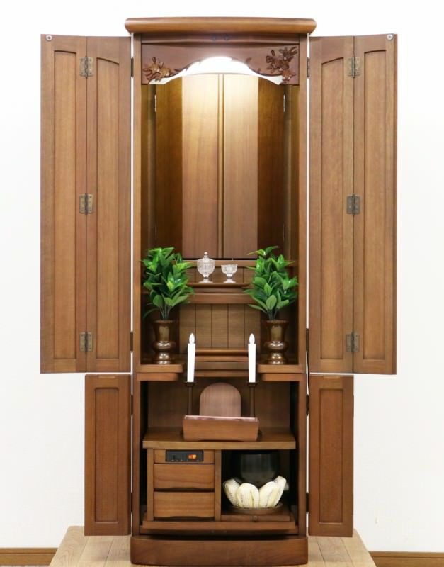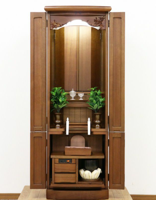 金剛堂製の二段重ねの家具調電動仏壇です。厨子上部に二重の桜の彫刻はオシャレな雰囲気漂うデザインに仕上がっております。