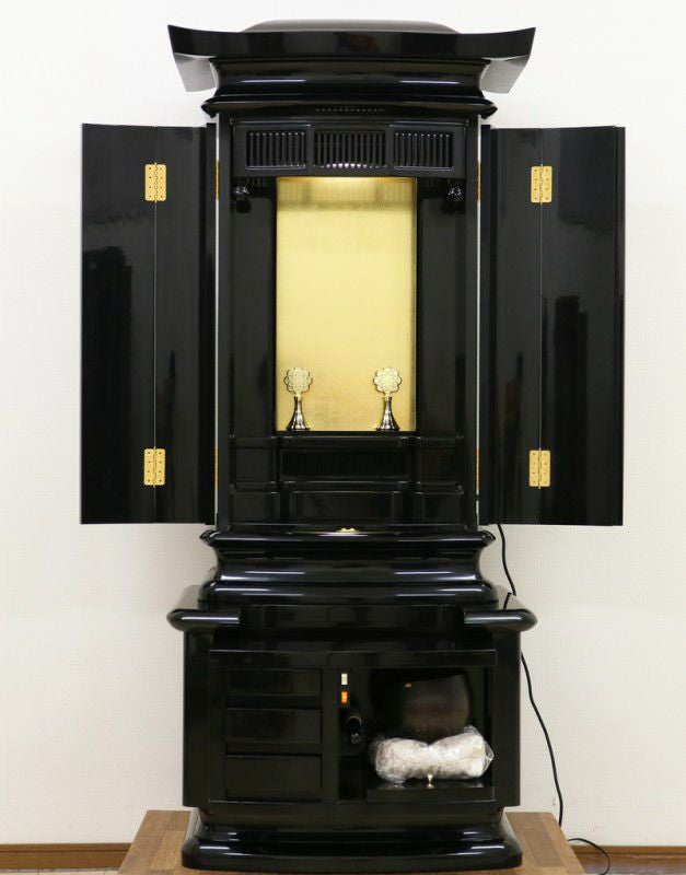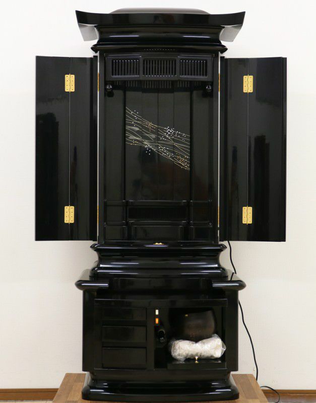 シックで落ち着いた色合いのブラックメタリック塗装ののお仏壇です。角度によって繊細なラメが感じられます。流れるような蒔絵の美しいB742.。格安にて提供させていただきます。