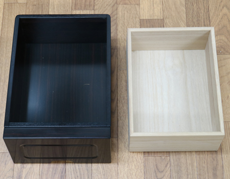 特装ご本尊様ご安置できる余裕の厨子サイズ、精錬された黒檀を使い重厚で精悍なデザインの仏壇を作り上げました。引き出しは桐の箱が中に入っております。