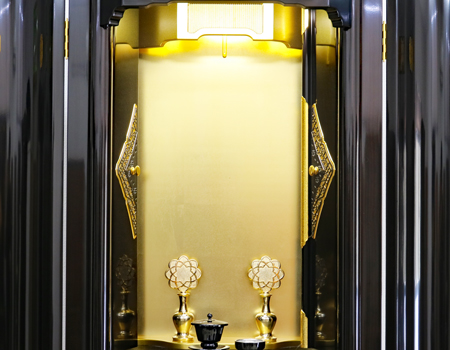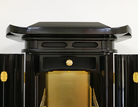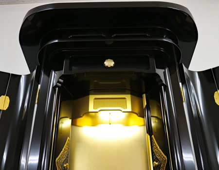 お厨子を開くと美しくクリア金色塗装の厨子板がご本尊様をさらに荘厳にしてくれます。 内部には蛍光灯照明も付属していますのでご本尊様を明るく照らしてくれます。
