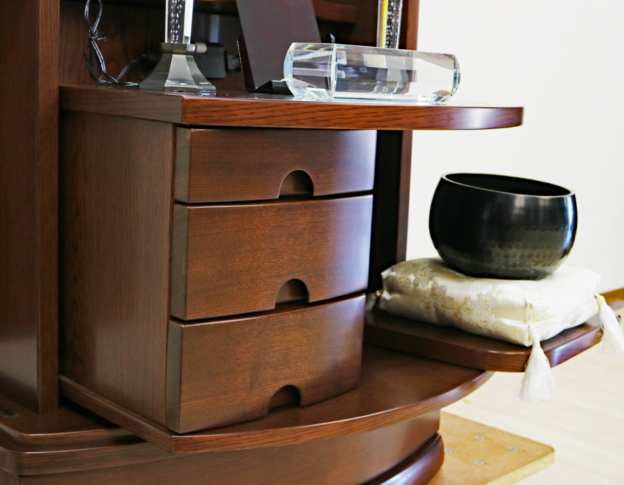 アンティーク調のおしゃれなお仏壇が中古仏壇に登場いたしました。お仏壇全体に渡る丸いフォルムが重厚感の中に優しさを感じさせます。虚空会と多宝塔、あなた自身の仏界を開くための 唱題が悠々とできるように思いを込めて作品に仕上げました。