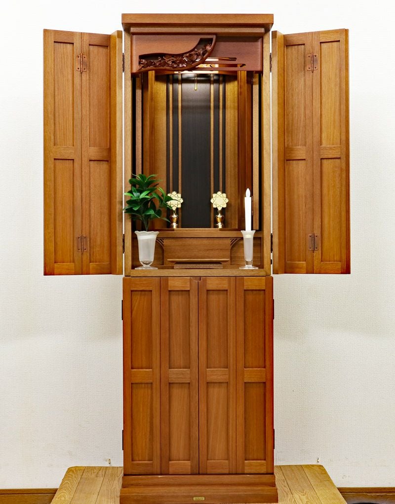 金剛堂さんで現在も販売されている「503ニヤトー総無垢ブリーゼ」の7年前商品となります。落ち着いた木のやさしさを感じるお仏壇です。扉が2箇所に分けられていますので、厨子だけ開閉ができスマートにご安置できます。洋室・一人暮らしにも最適です。