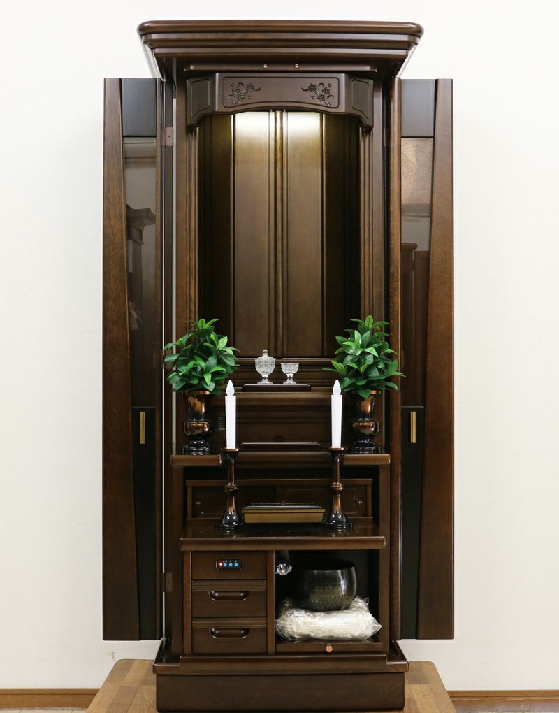 大戸に大きなガラスがついているのが、特徴の徳島製唐木仏壇です。今までのお仏壇のデザインではなかった、オシャレな雰囲気漂うデザインに仕上がっております。収納引き出しも多いので機能的にご使用いただけます。
