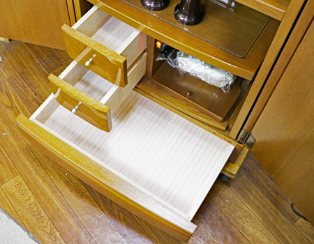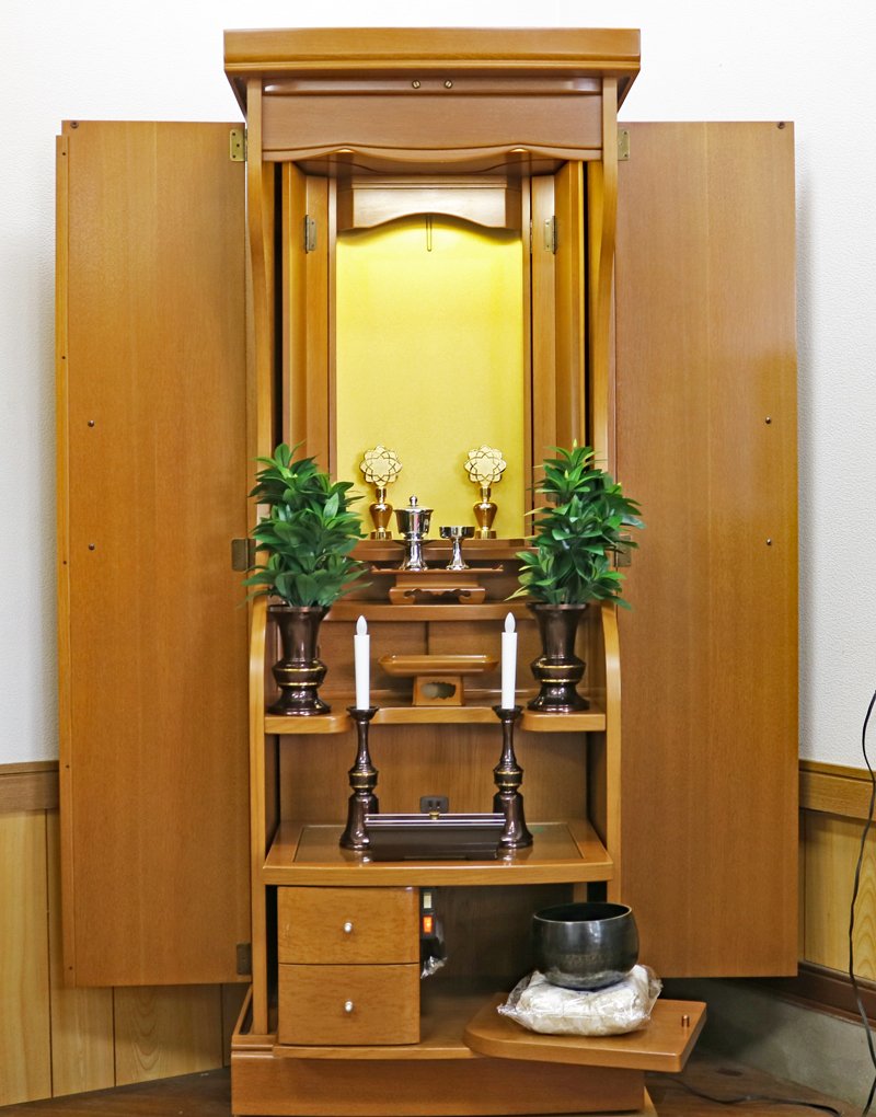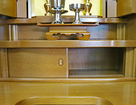 押し込み式の大戸でナチュラルな色味、デザインの中古仏壇です。押し込み式の大戸なので、押し込むことによってご本尊様を斜めからでもご本尊様を拝すことができます。