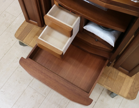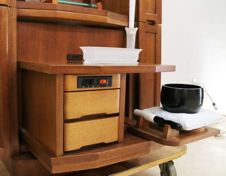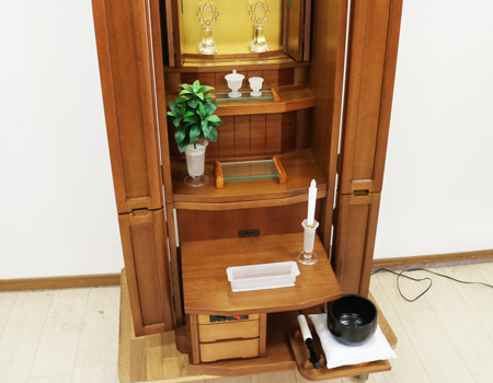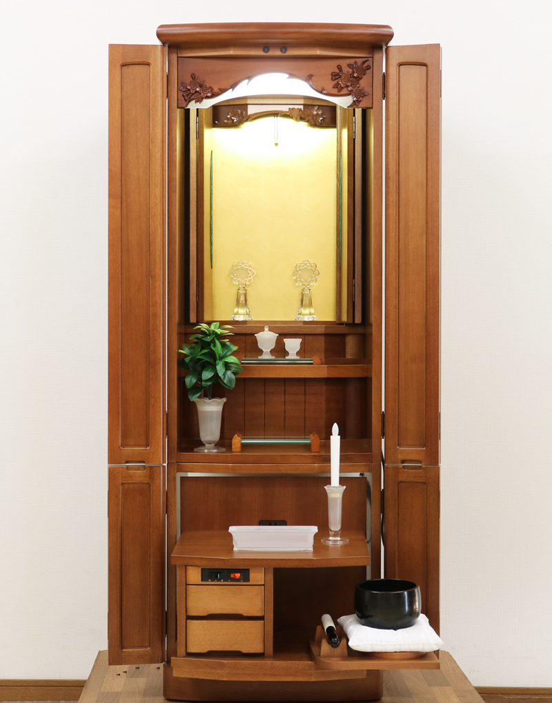 落ち着いた木のやさしさを感じるお仏壇です。婦人部女子部に大人気の商品です。扉が2箇所に分けられていますので、厨子だけ開閉ができスマートにご安置できます。洋室・一人暮らしにも最適です。