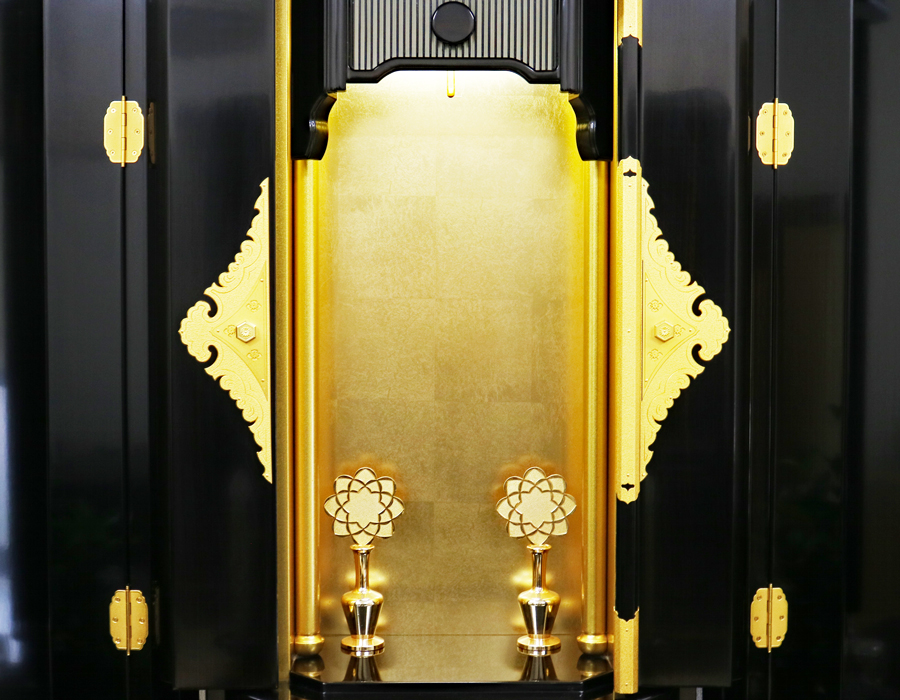 お厨子を開くと美しくクリア金色塗装の厨子板がご本尊様をさらに荘厳にしてくれます。 内部には蛍光灯照明も付属していますのでご本尊様を明るく照らしてくれます。