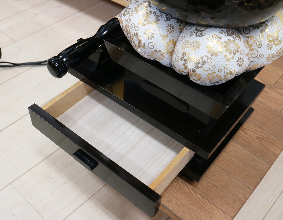 仏壇下部に膳引きと引きだしが2箇所ございます。