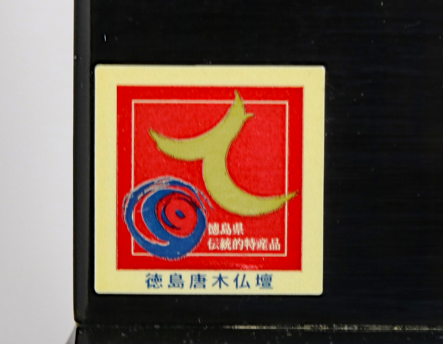 仏壇製造で有名な徳島県産のお仏壇です。徳島仏壇の証明ラベルが仏壇側面、背面にございます。
