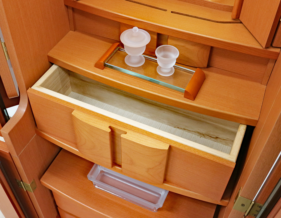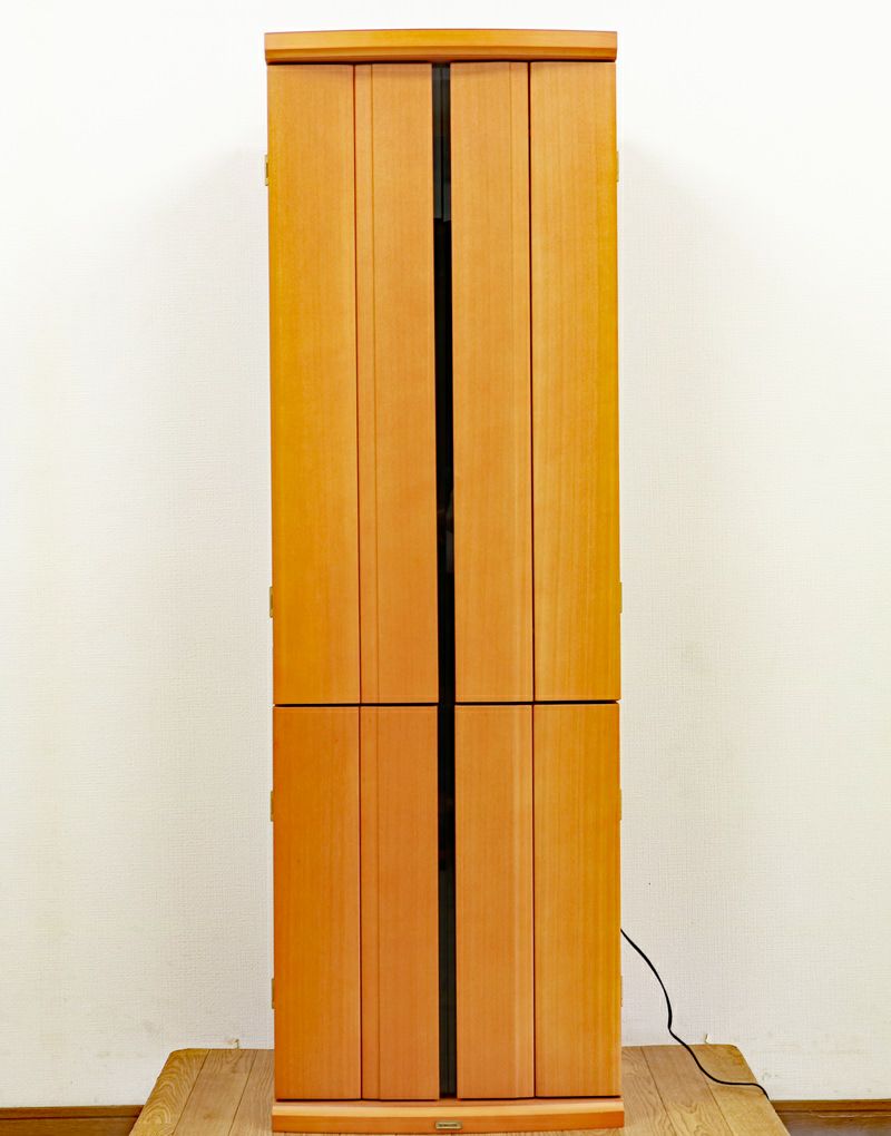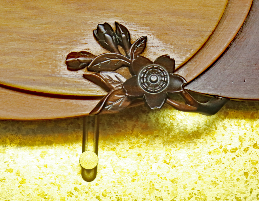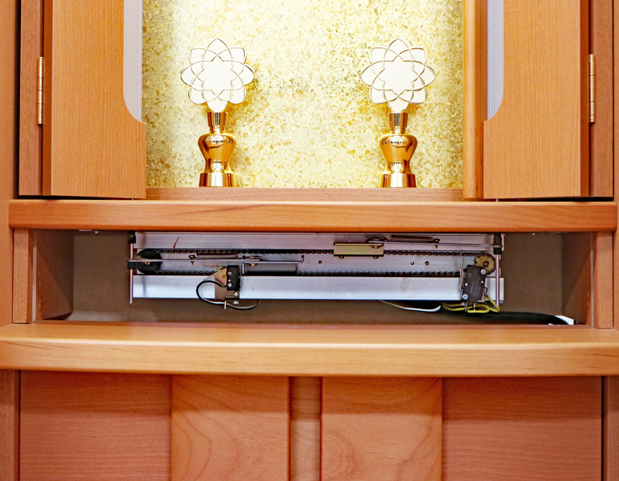 金剛堂製の二段重ねの家具調電動仏壇です。厨子上部にある桜の彫刻はオシャレな雰囲気漂うデザインに仕上がっております。大扉と厨子扉の中央にすりガラスが施されているスマートなデザインも特徴的です。和室・洋室・リビングダイニングにも最適です。