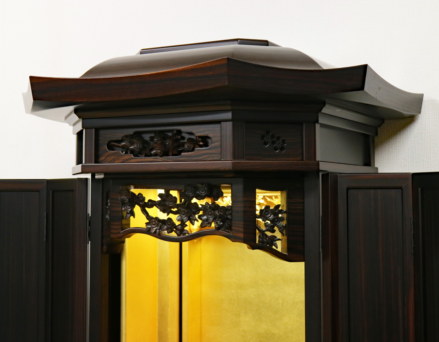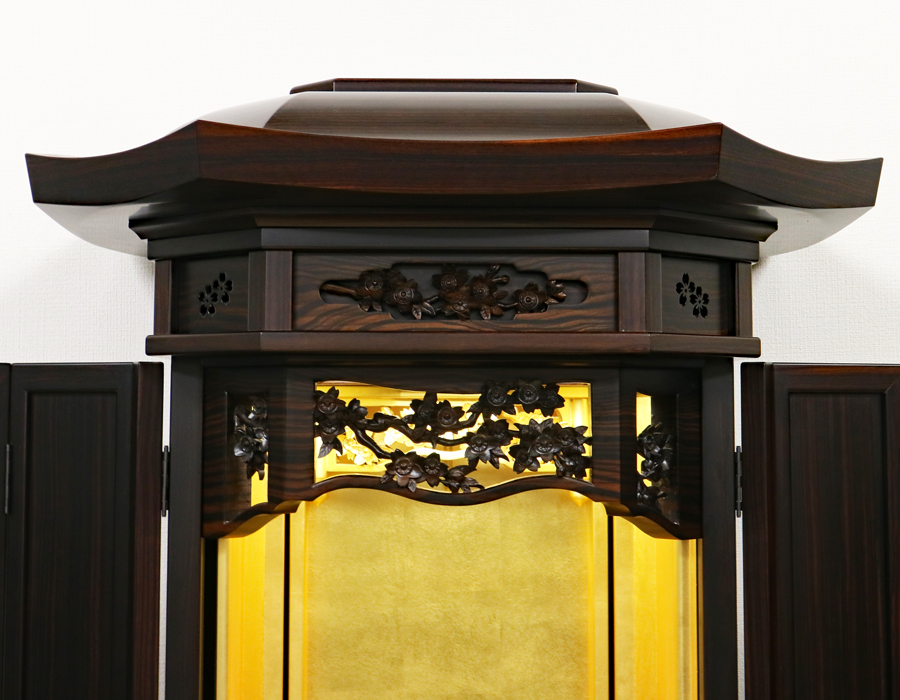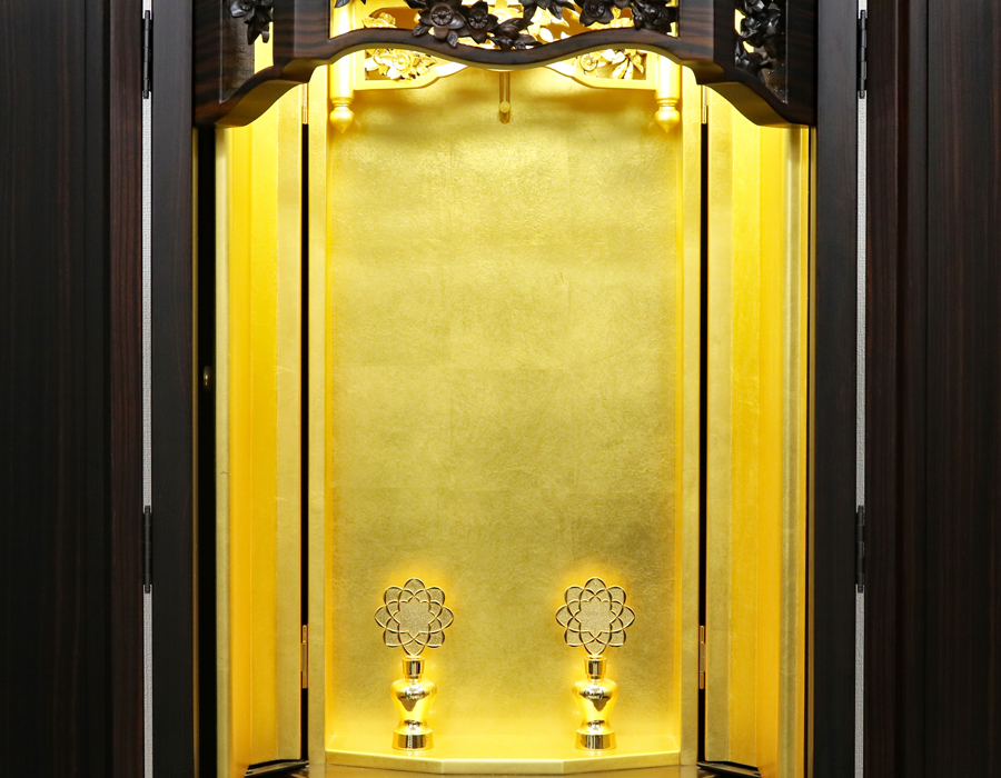 本金箔と金色塗装では輝きが違うのは一目瞭然です。 内部には蛍光灯照明も付属していますのでご本尊様を明るく照らしてくれます。