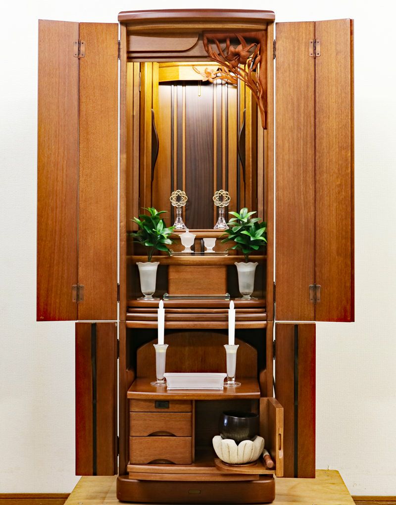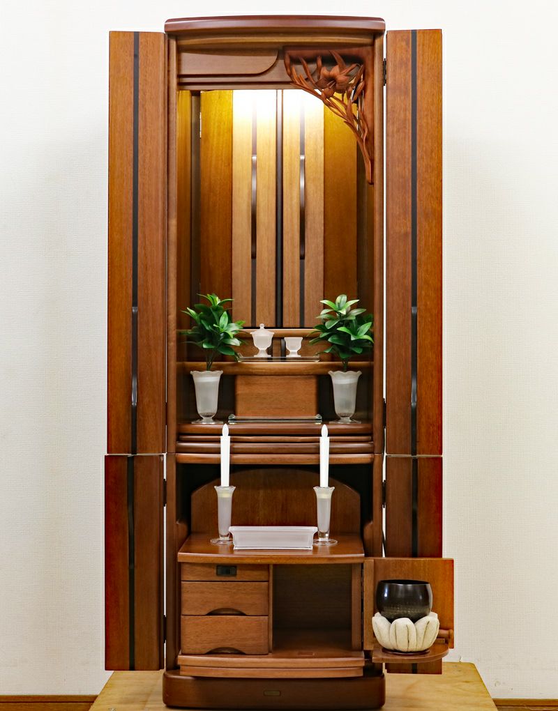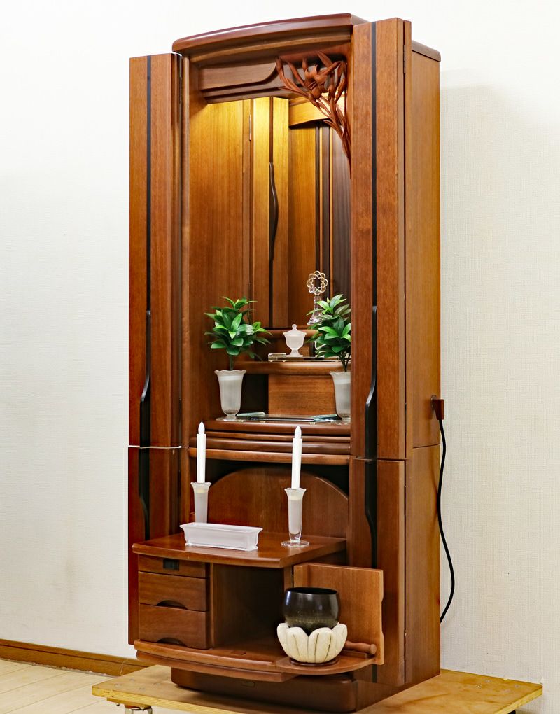 金剛堂さんの「52号マホガニヨーロピアン」の中古商品となります。落ち着いた木のぬくもりを感じるお仏壇です。扉が2箇所に分けられていますので、厨子だけ開閉ができスマートにご安置できます。洋室・一人暮らしにも最適です。