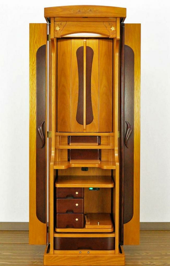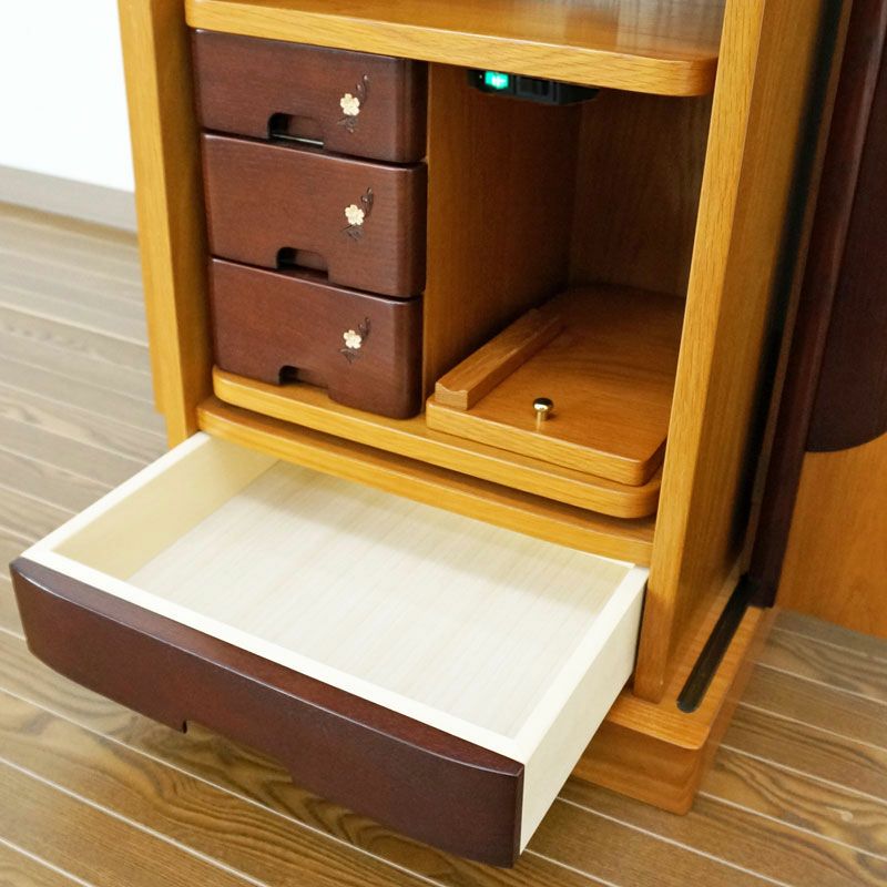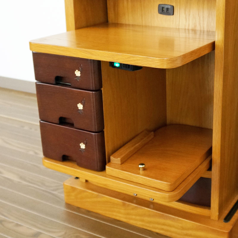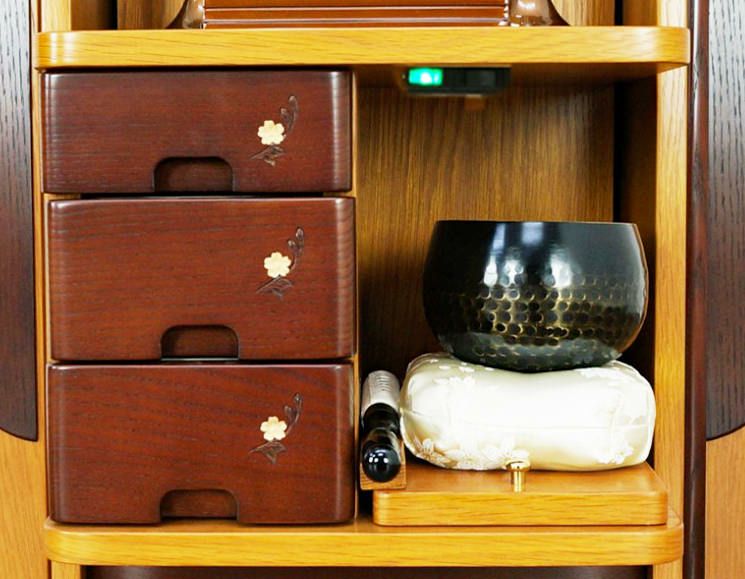 収納式経机には3段の引き出しをご用意しております。お念珠・お教本などお線香なども余裕で収納できます。