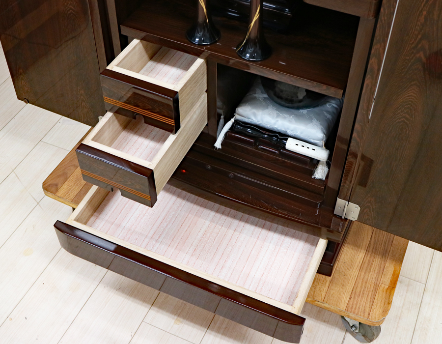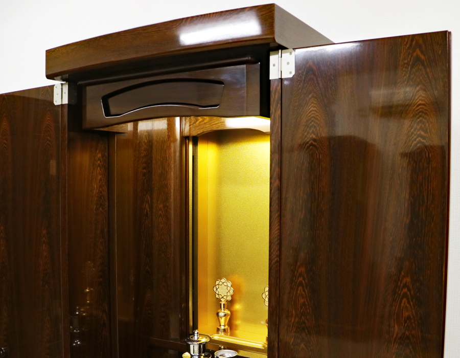 光沢のある鉄刀木色の家具調中古仏壇です。押し込み式大戸ですので、押し込むことで斜めからもご本尊様を拝すことができます。