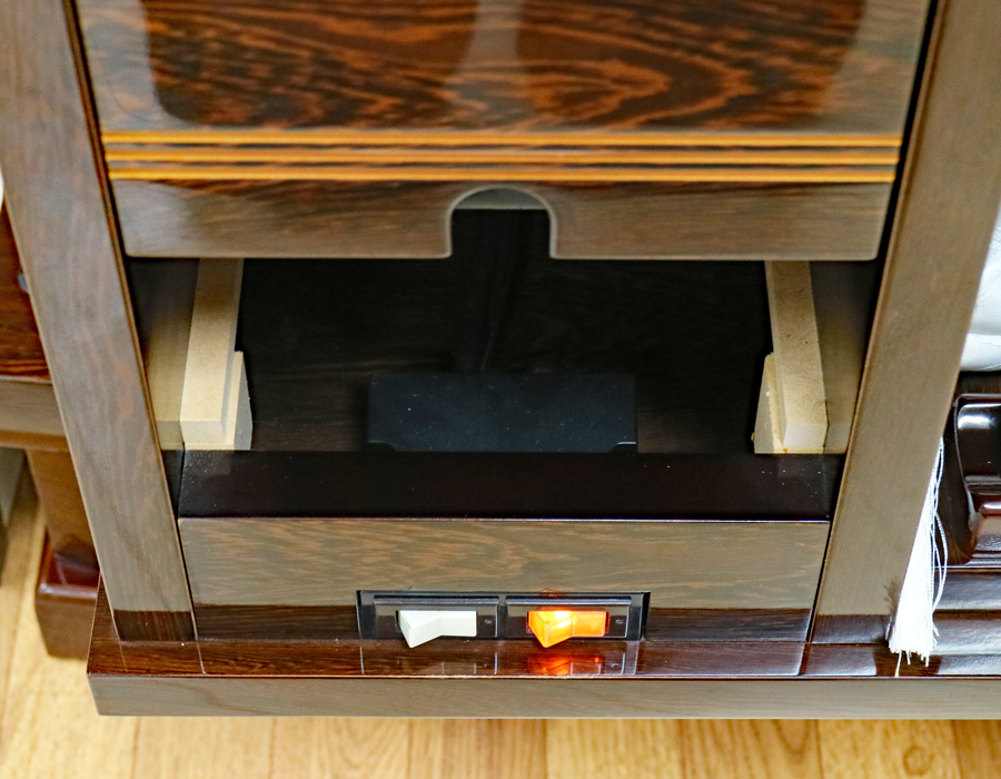 収納経机のの引き出しを引き出すと、スイッチボックスが取り付けられているが見えます。