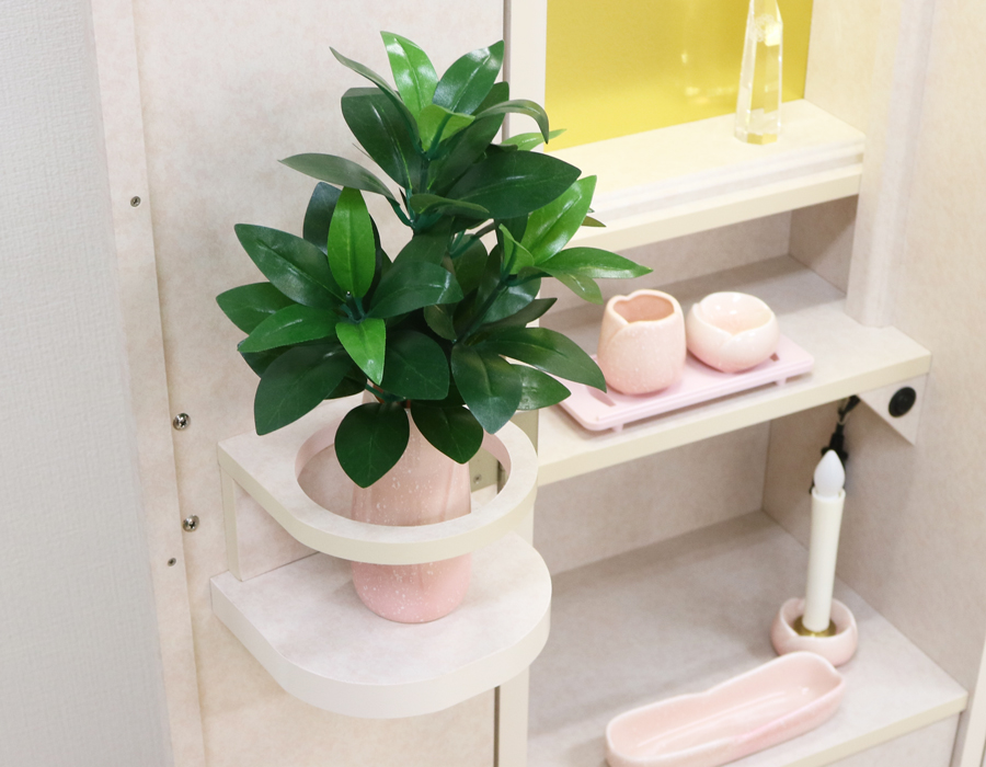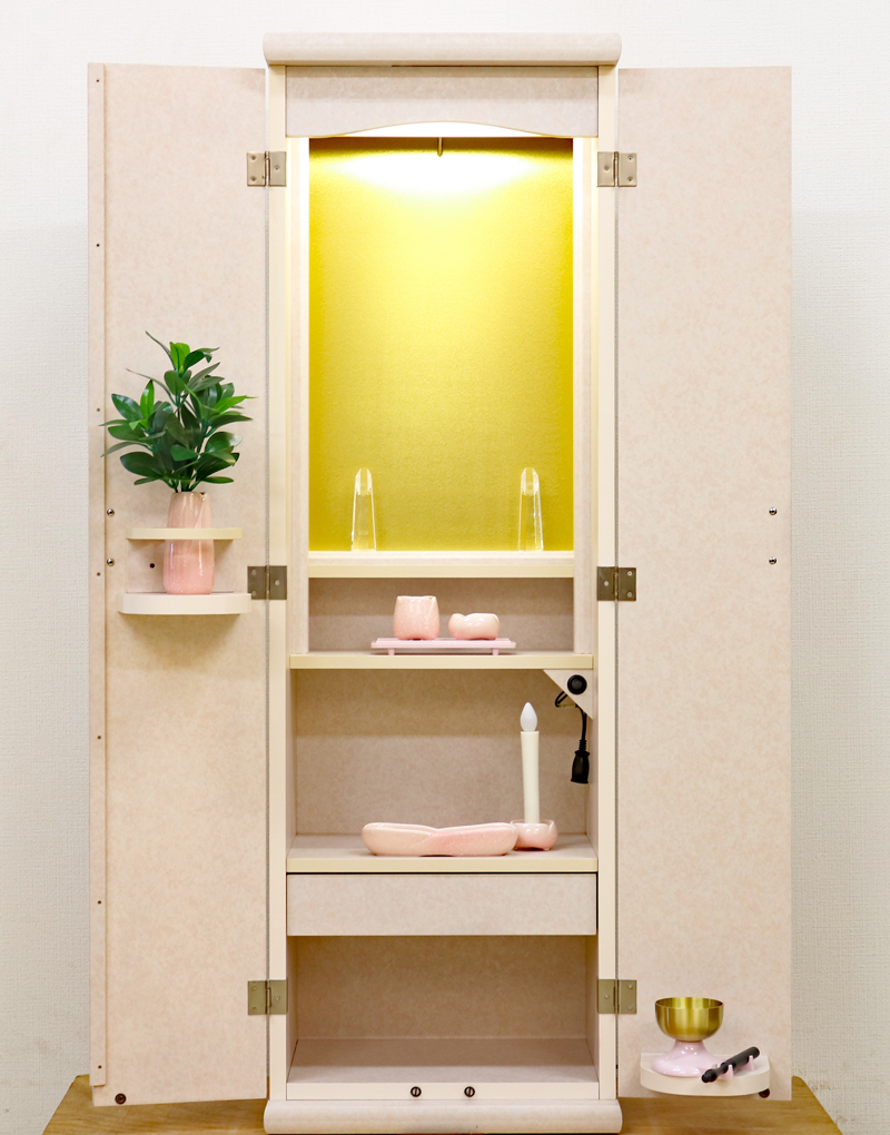 こちらのお仏壇は、現在仏具付価格64,800円で販売中の「スマート」ピンクの中古仏壇です。お手頃価格ですので、ワンルームや就職・大学進学・お一人暮らしにも最適です。