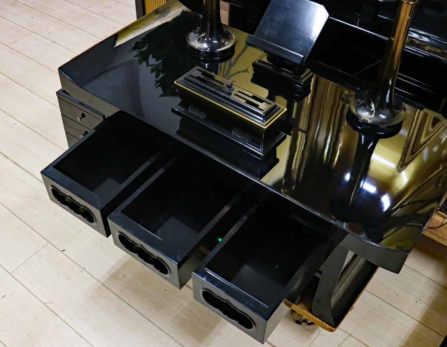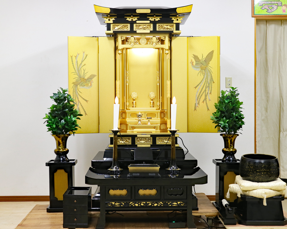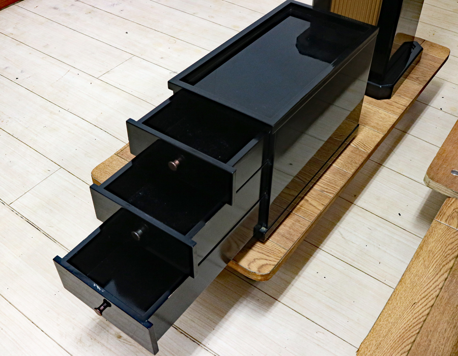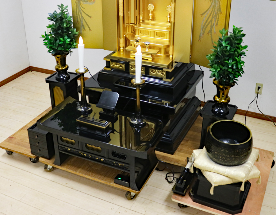 今回の目玉は何か!なんと電気関係をすべて新品に付け替えました!つまり、自動開閉機:コードアセンブリ:スイッチ:LED照明2機搭載、これで電気関係は刷新しましたので安心、安全に末永くお使いいただけます。貴重な黒塗りですので前所有者も会場閉鎖に伴う理由で当店に買取りを申し込まれた経緯がありました。非常に丁寧にお使いいただけていましたのでとても良い状態のお仏壇で到着しました。