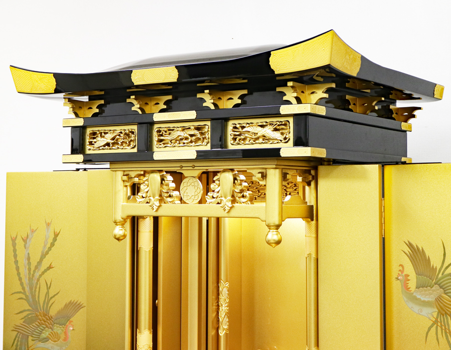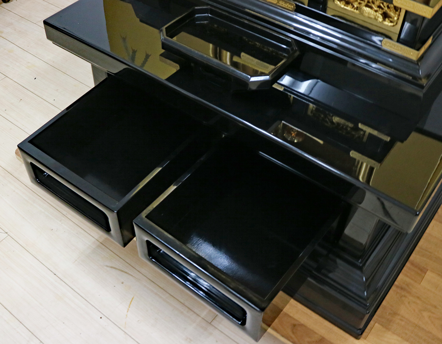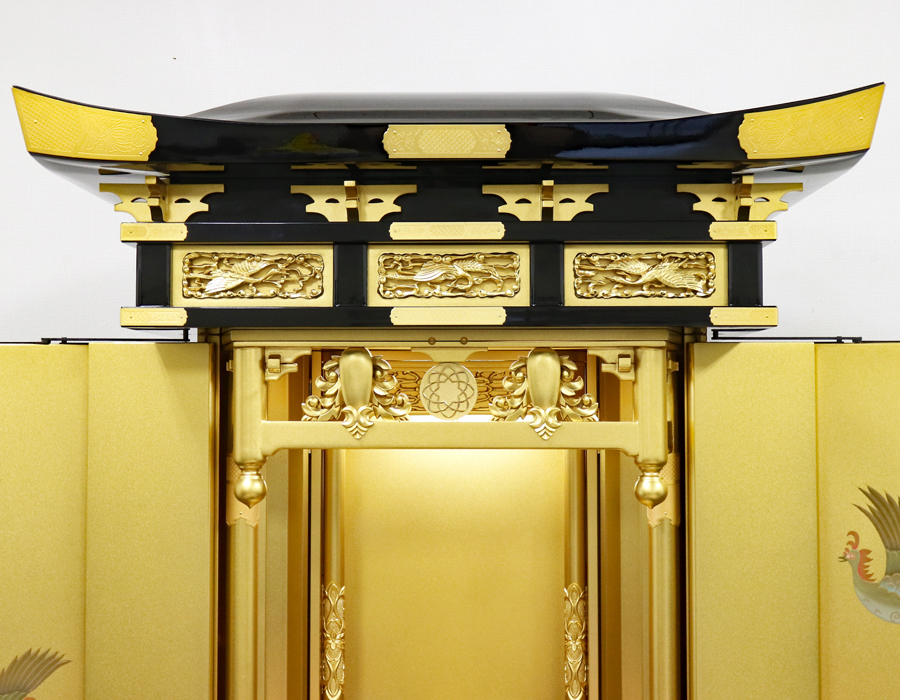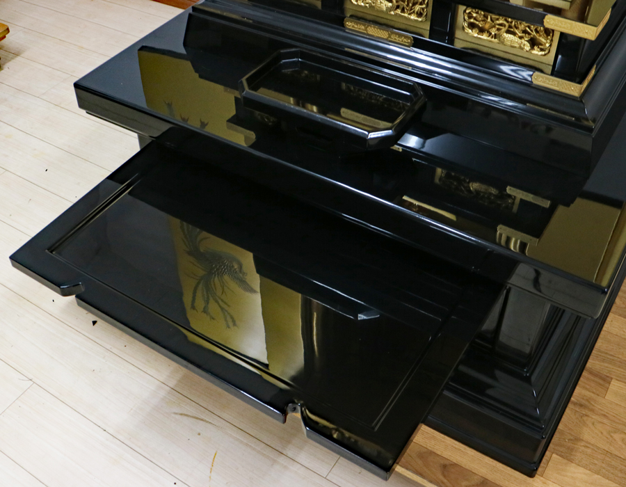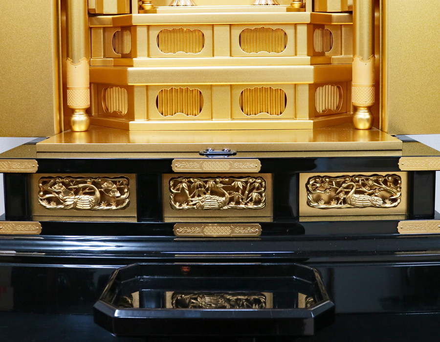 厨子下の部分に細部こだわる彫が施されており、黒と金のコントラストが美しいデザインとなっております。