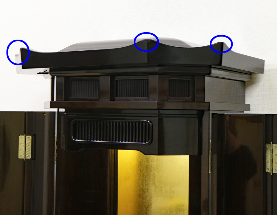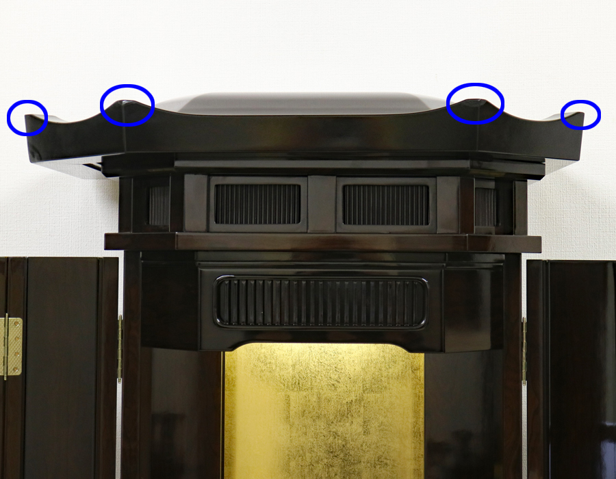 屋根の角(青丸の箇所)4箇所にうち傷がございましたので。当店にて補修いたしました。