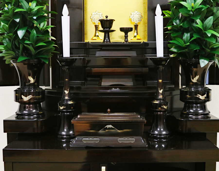 仏具付きをお選びの方は、鶴と富士山の彫金入りの仏具セットが付属致します。