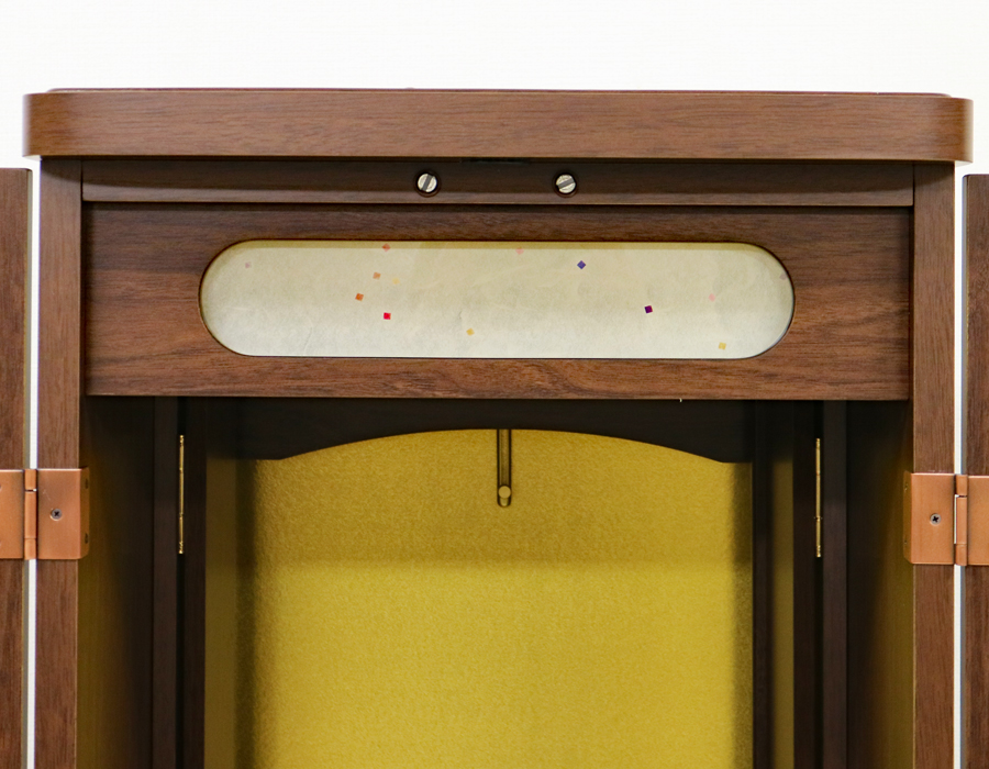 欄間のデザインが通常のニュースマイルと違う和紙風のデザインになっております。コンパクトでワンルームでも安心の家具調電動仏壇です。