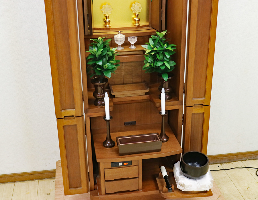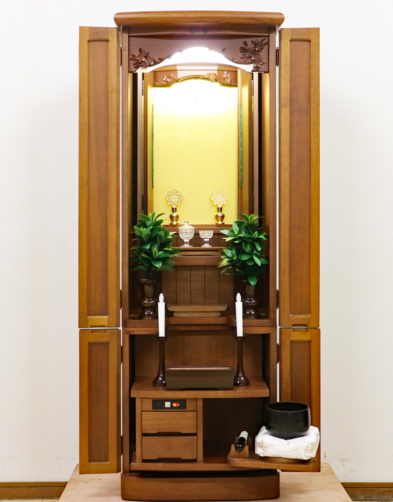 落ち着いた木のやさしさを感じるお仏壇です。無垢板を使用しているので、年数とともに色合いが変わり味が出てきます。婦人部女子部に大人気の商品です。扉が2箇所に分けられていますので、厨子だけ開閉ができスマートにご安置できます。洋室・一人暮らしにも最適です。