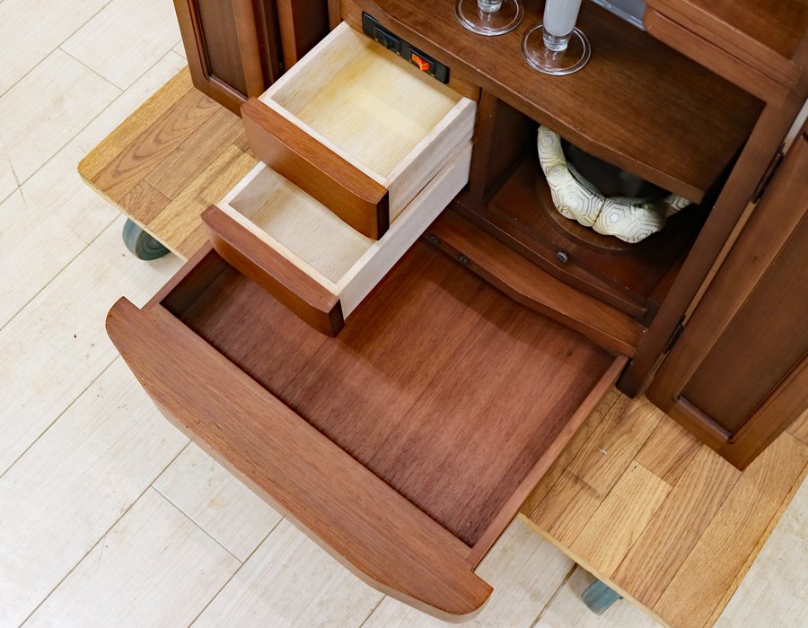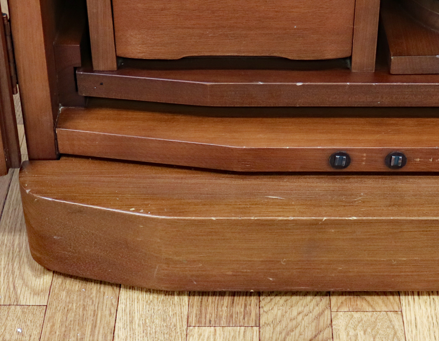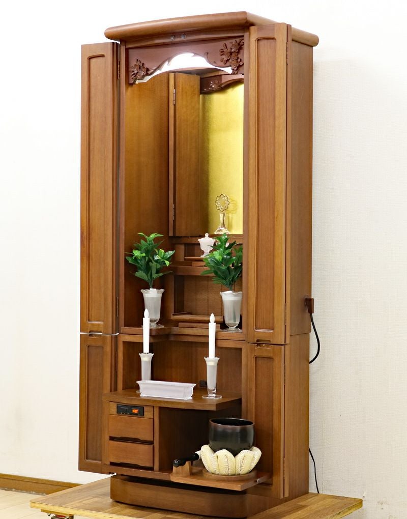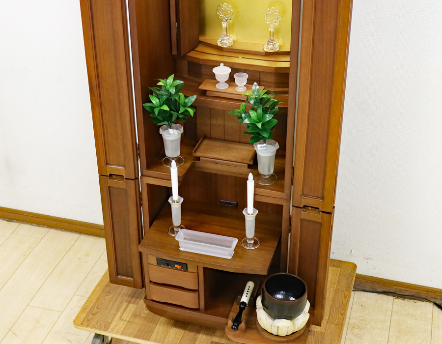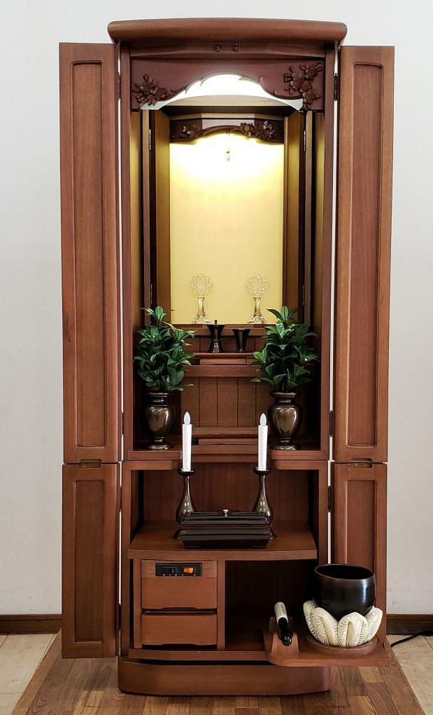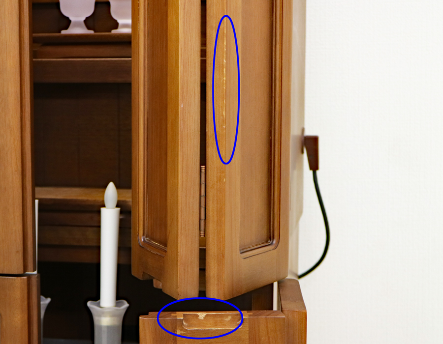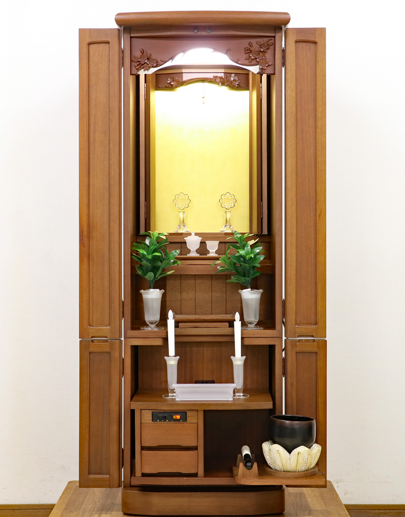 傷が多々見受けられるためB級仏壇として格安にてご提供させていただきます。落ち着いた木のやさしさを感じるお仏壇です。無垢板を使用しているので、年数とともに色合いが変わり味が出てきます。婦人部女子部に大人気の商品です。扉が2箇所に分けられていますので、厨子だけ開閉ができスマートにご安置できます。洋室・一人暮らしにも最適です。