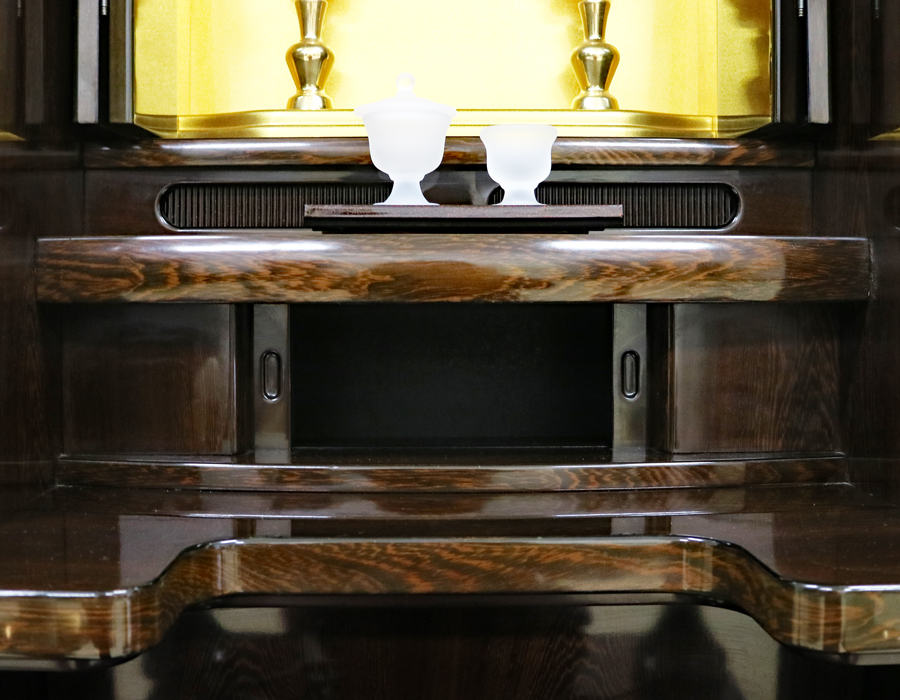 大戸に若干の日焼け見受けられるためB級仏壇として格安にてご提供させていただきます。当店にて照明をLED照明に変更いたしました。押し込み式大戸ですので、押し込むことで斜めからもご本尊様を拝すことができます。