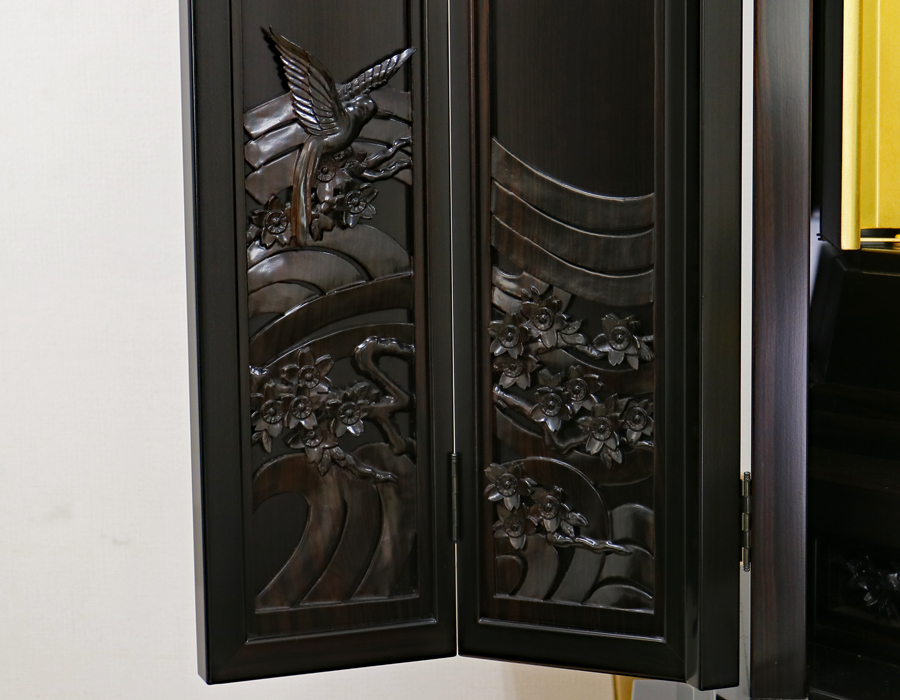 本格的な厨子型経机付き仏壇となります。厨子扉に施された金具は圧巻です。花台、リン台、線香箱もついているので、拠点にお勧めとなっております。欄間や大戸などいたるところに職人こだわりの彫が施されております。金剛堂さんで現在仏具付き価格18,44,920円で販売中の33本黒檀瑠璃鳥の以前のバージョンです。高さ約10cmの置台が付属いたしますので、仏壇の全長は約199cmになります。(置き台無し189?pでもご注文頂けます。台無し1万円引き)