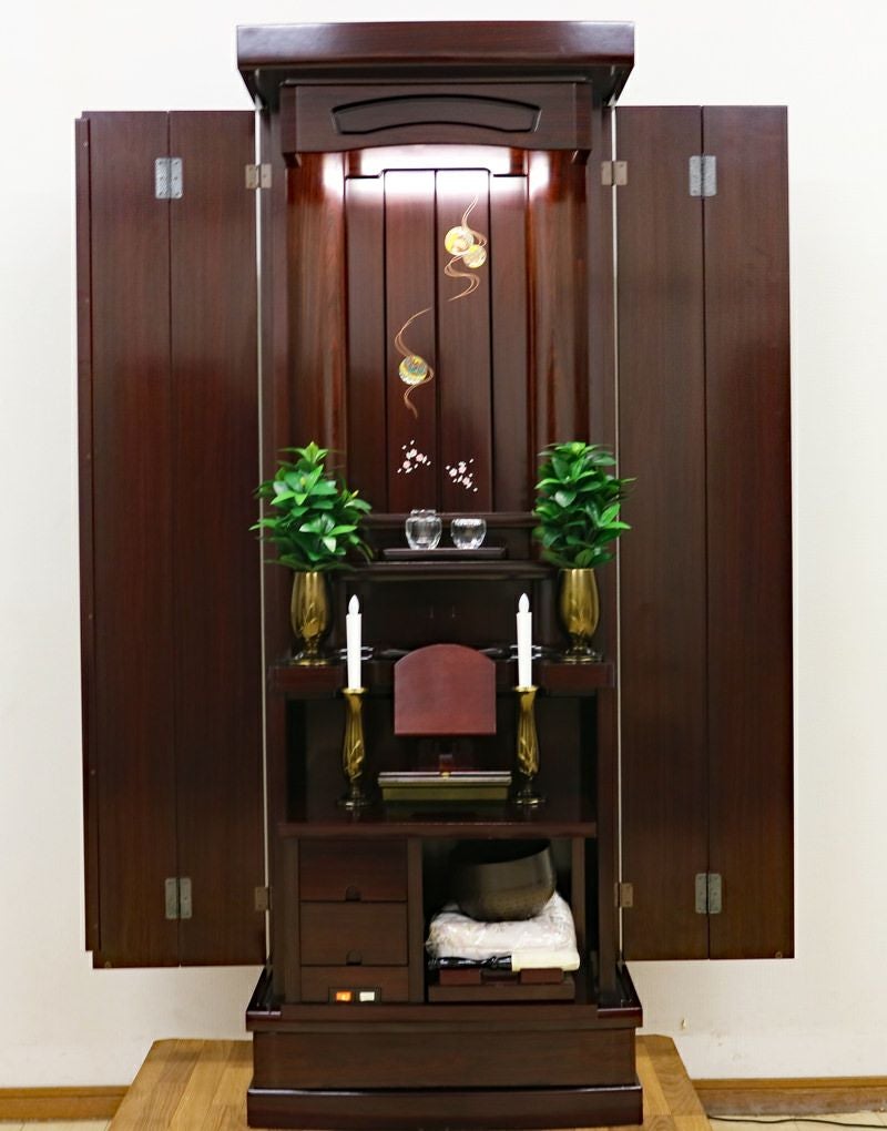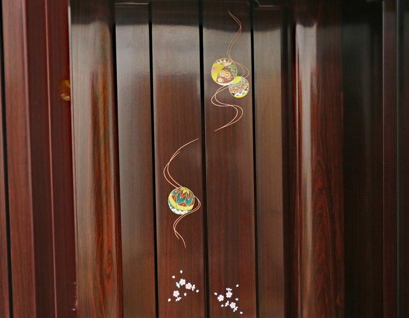 側面に傷が複数見受けられるためB級仏壇として格安にてご提供させていただきます。厨子扉には、まりと桜のかわいらしい蒔絵が施されております。押し込み式大戸ですので、押し込むことで斜めからもご本尊様を拝すことができます。