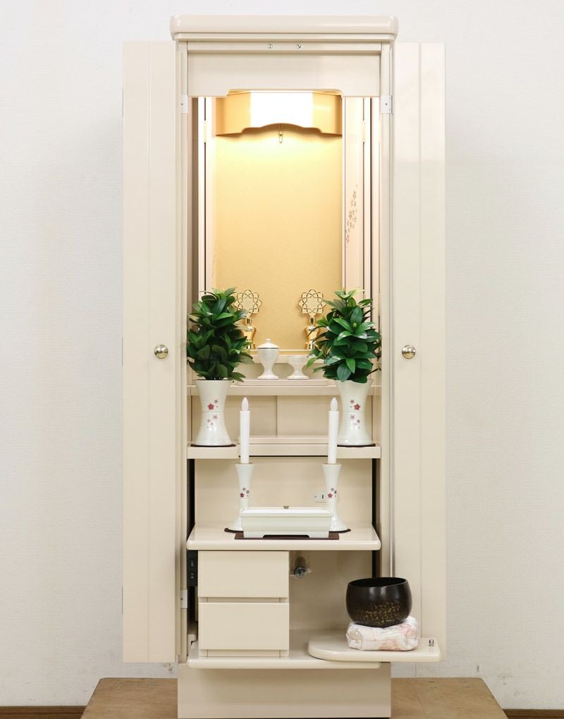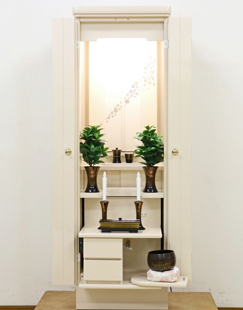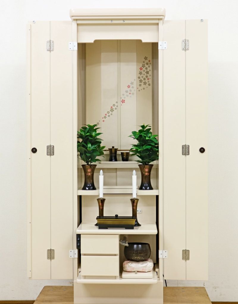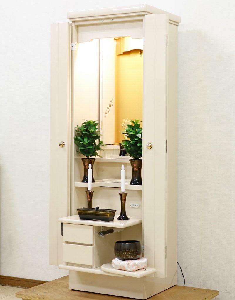 使用年数がわずか4年、LED照明付きで、現在当店にて、新品仏具付価格288,000円で販売中の「フロート パールホワイト」の中古仏壇です。展示品レベルのきれいな仏壇ですのでお勧めです! 厨子扉に綺麗な流れ桜の蒔絵がデザインされております。新品はこちらをクリック