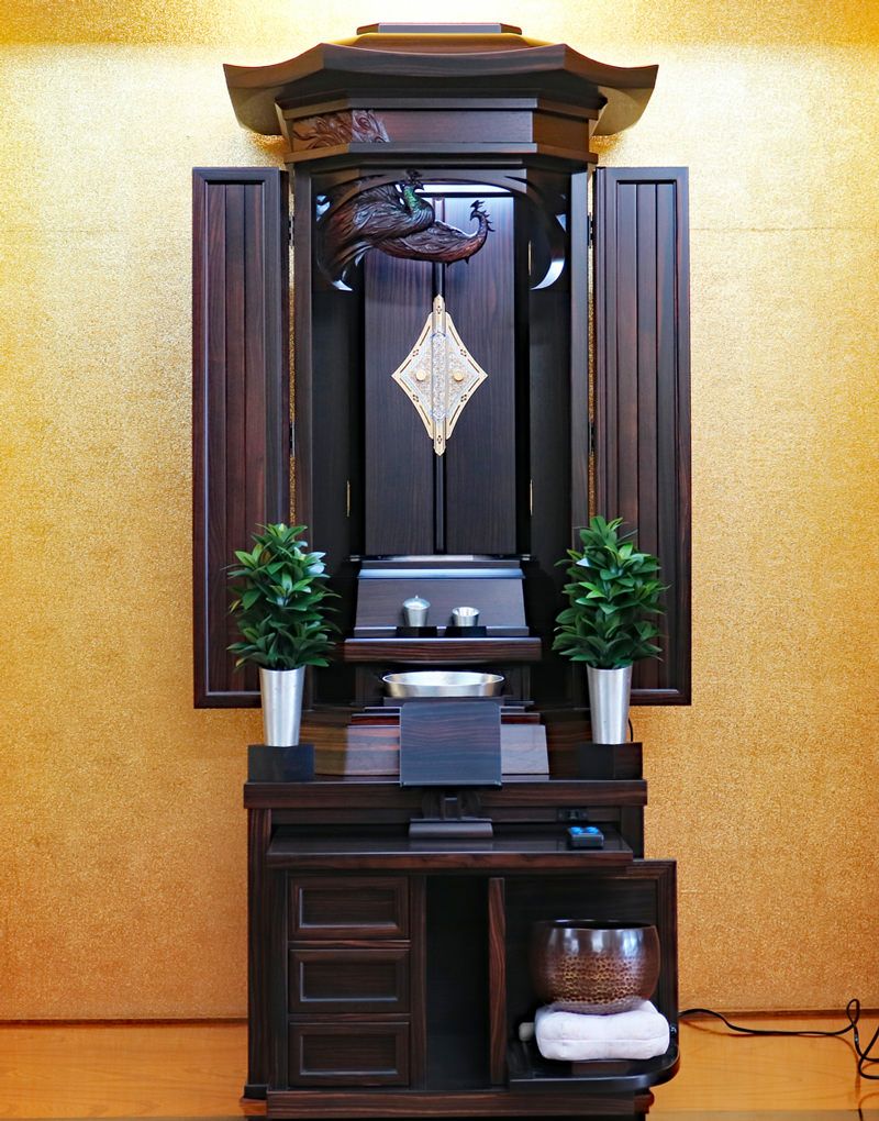 お厨子を開くと美しい西陣仕様の厨子板がご本尊様をさらに荘厳にしてくれます。 内部には蛍光灯照明も付属していますのでご本尊様を明るく照らしてくれます。