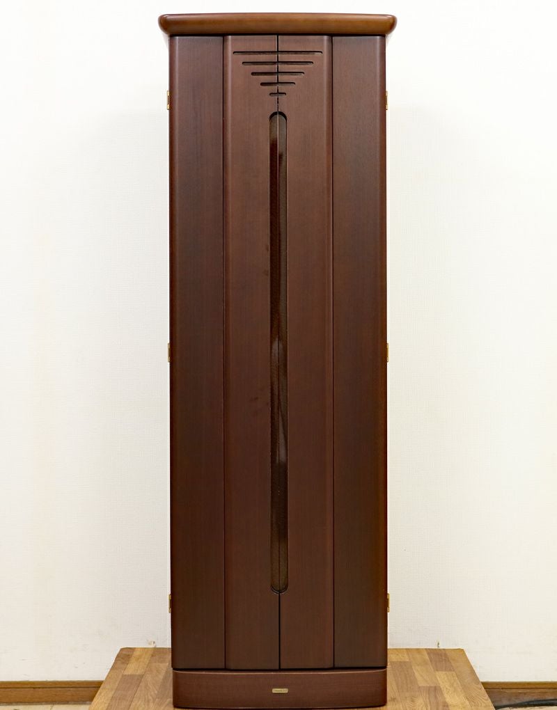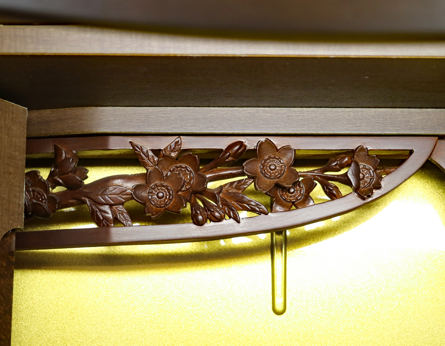 13年前に製造された金剛堂製の家具調中古仏壇アップルウッドです。当店にてお厨子の金板を新品のものと交換いたしました。厨子上部にある桜の彫刻はオシャレな雰囲気漂うデザインに仕上がっております。和室・洋室・リビングダイニングにも最適です。