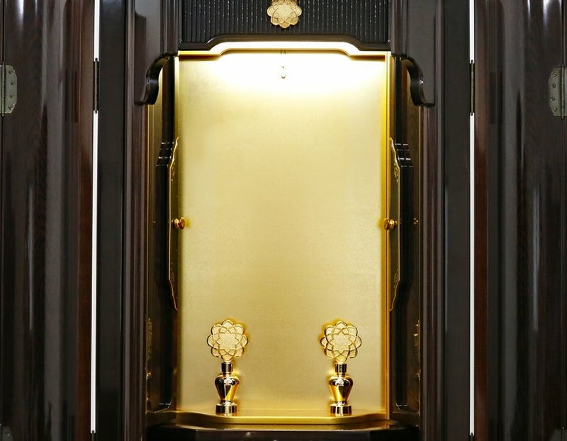 お厨子を開くと美しくクリア金色塗装の厨子板がご本尊様をさらに荘厳にしてくれます。 内部には蛍光灯照明も付属していますのでご本尊様を明るく照らしてくれます。
