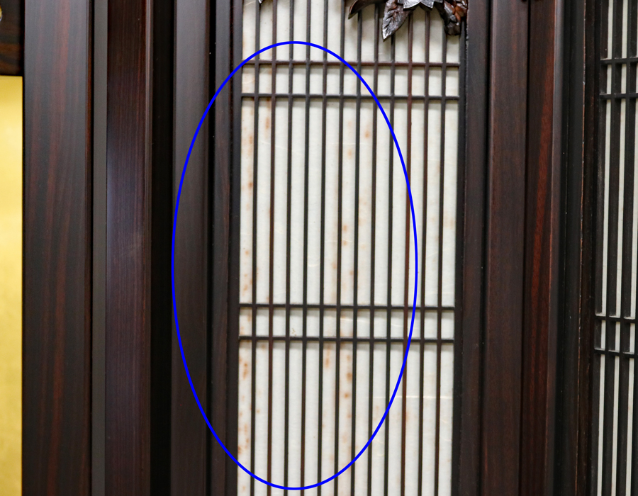 上記お写真の青丸の箇所(経机左前角)に打ち傷がございます。