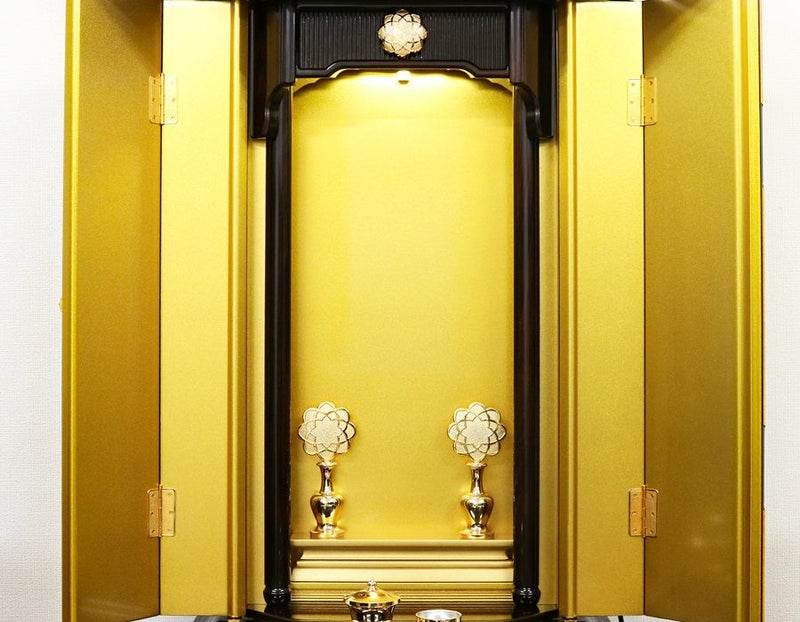 お厨子を開くと美しくクリア金色塗装の厨子板がご本尊様をさらに荘厳にしてくれます。 内部には蛍光灯照明も付属していますのでご本尊様を明るく照らしてくれます。