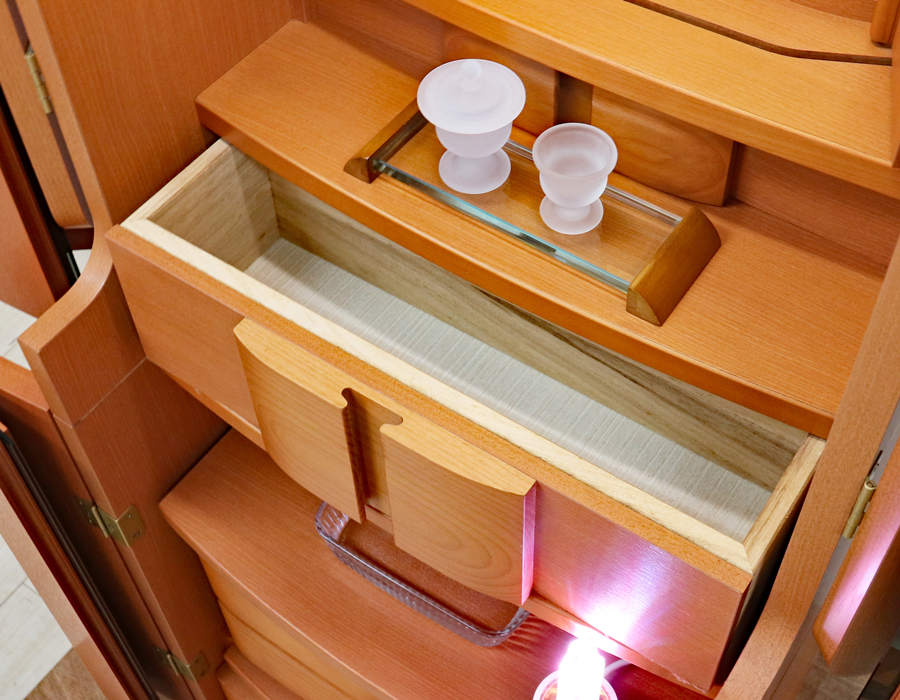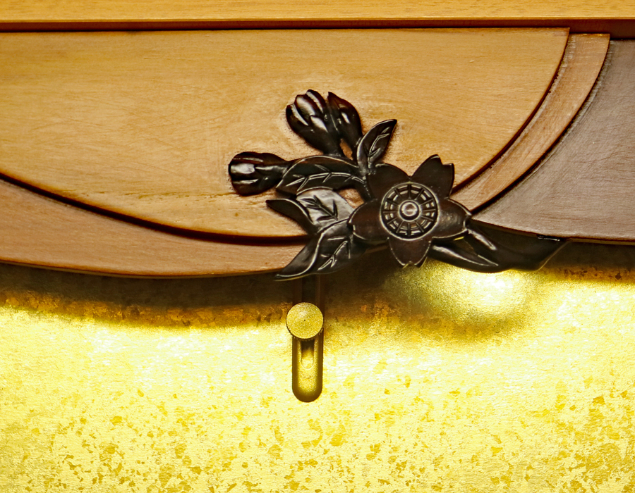金剛堂製の二段重ねの家具調中古仏壇です。厨子上部にある桜の彫刻はオシャレな雰囲気漂うデザインに仕上がっております。大扉と厨子扉の中央にすりガラスが施されているスマートなデザインも特徴的です。和室・洋室・リビングダイニングにも最適です。