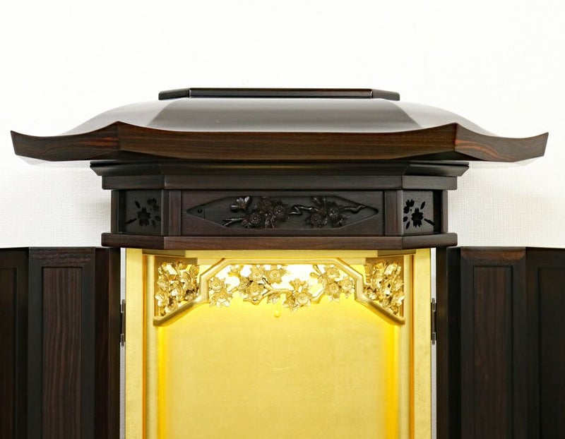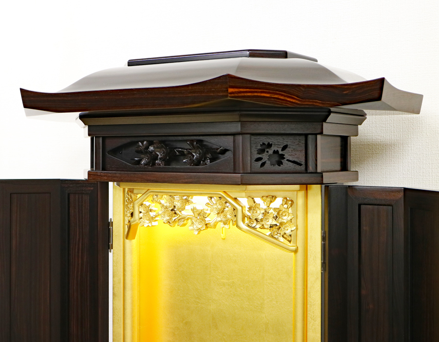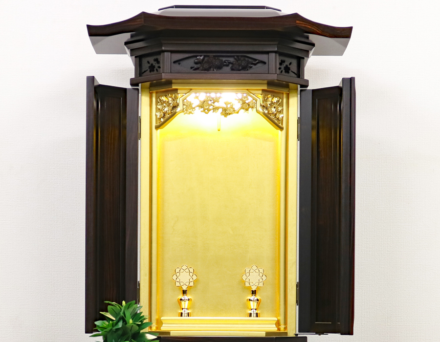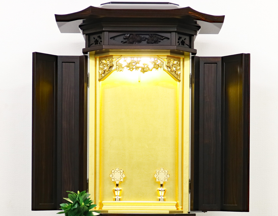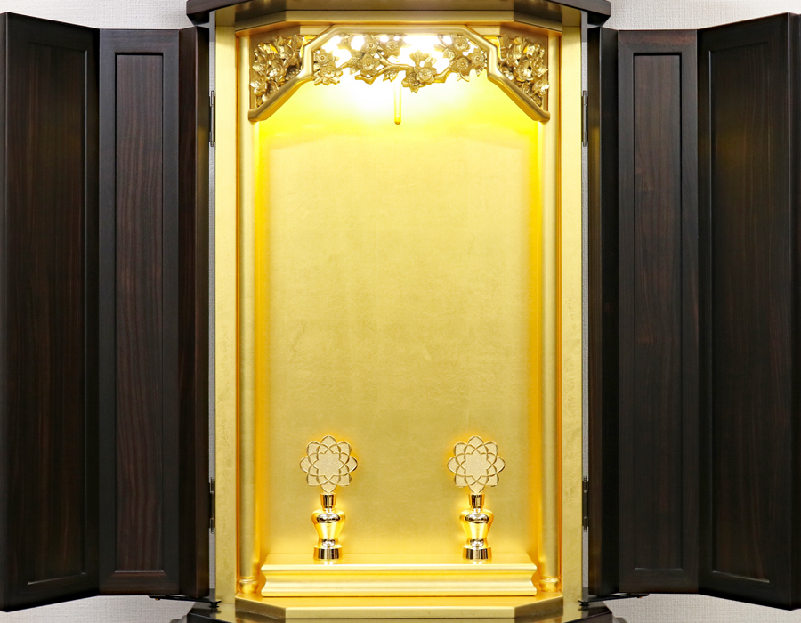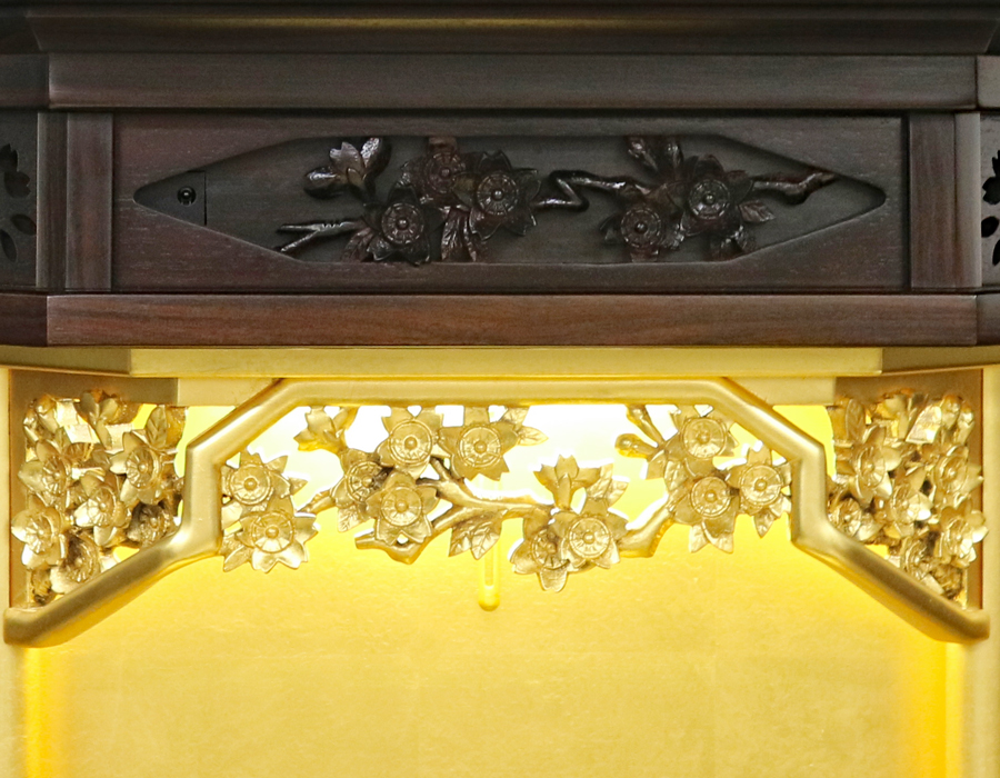 本金箔と金色塗装では輝きが違うのは一目瞭然です。 内部には蛍光灯照明も付属していますのでご本尊様を明るく照らしてくれます。