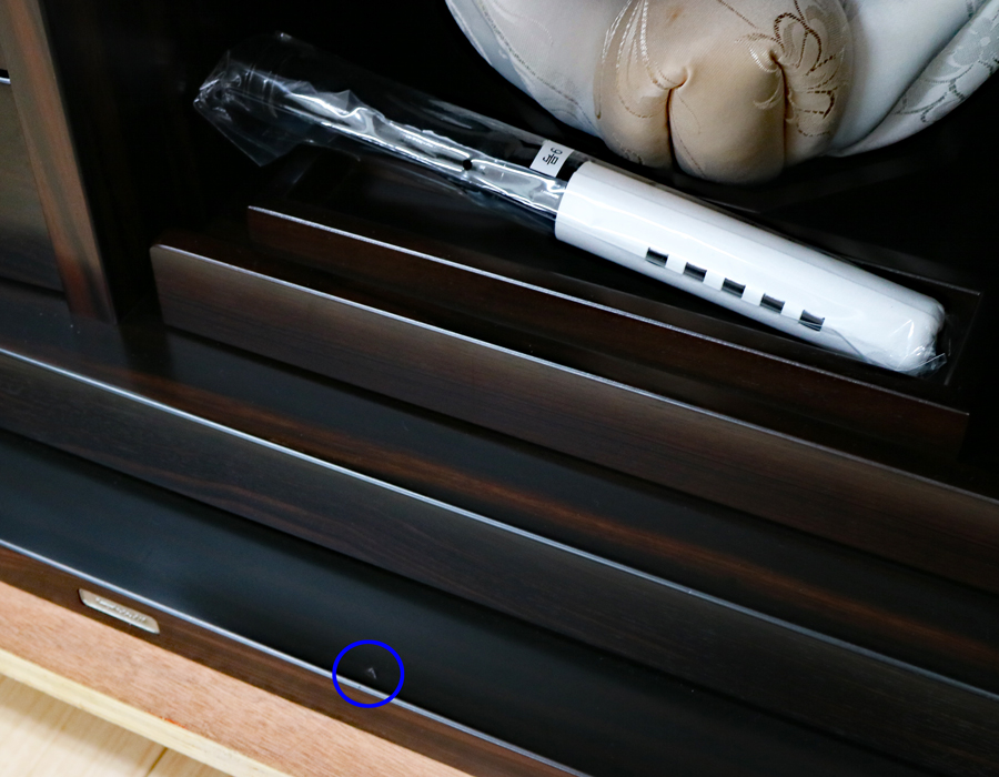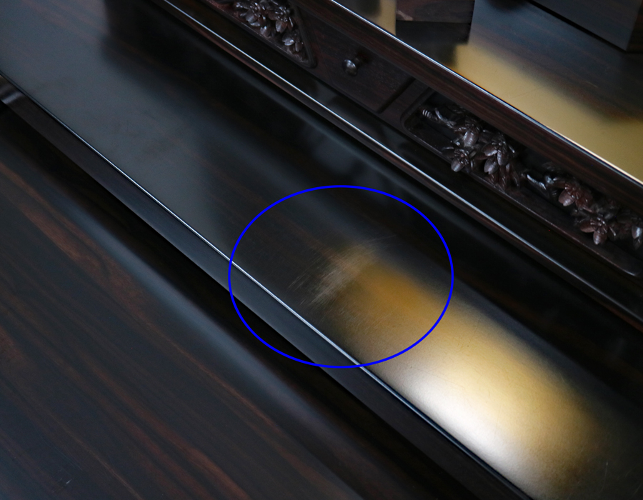 上記お写真の青丸の箇所(三宝置く箇所)に擦り傷がございます。