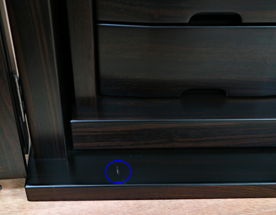 上記お写真の青丸の箇所(引き出し下)に小さな傷がございます。