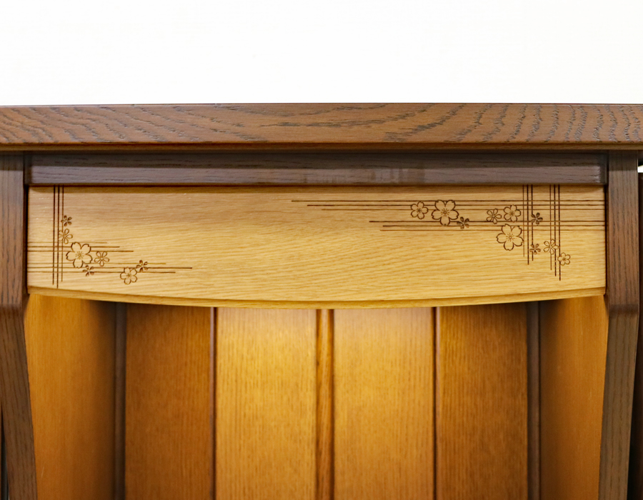 かわいらしいデザインが特徴の家具調中古仏壇970の登場です。仏壇製造で名高い徳島産のお仏壇となります。ナラ材をふんだんに使用した、8年前製造のお仏壇です。押し込み式大戸ですので、押し込むことで斜めからもご本尊様を拝すことができます。拠点・会場用にも充分対応できます。